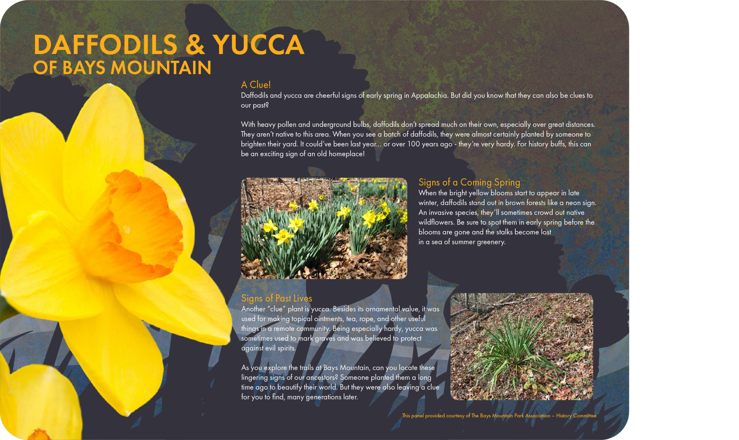 Summer 2024 – Historical “daffodil” signs have been placed at the Ledbetter site in Front Hollow and the McClain site on Azalea Trail. Another sign was place at the Moonshine Still on Chinquapin Trail. Also, simple “homesite” signs have been placed at the Ledbetter site, the Gragg site on Lake Rd (west), the McClain site, and the Dolen Shed site on Lake Rd.